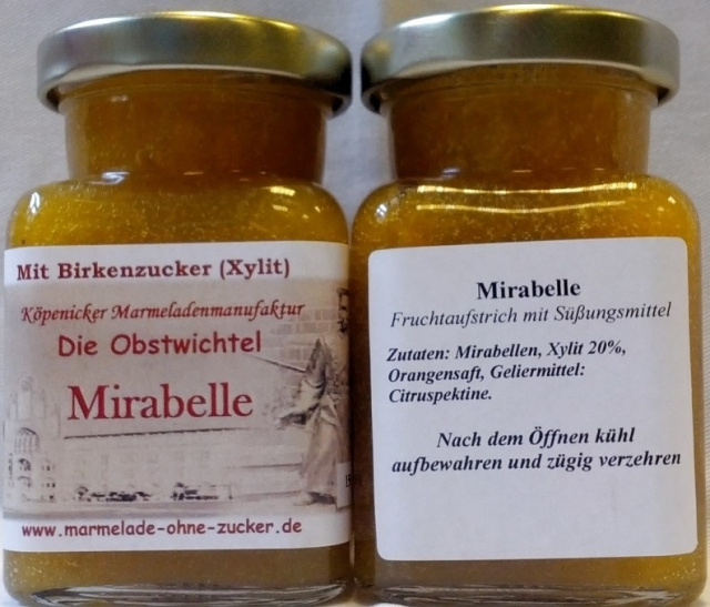 Zutaten: Mirabellen, Xylit 20%, Orangensaft, Geliermittel: Citruspektine