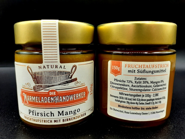 Zutaten: Mangos, Pfirsiche, Xylit 20%, Orangensaft, Geliermittel: Citruspektine
