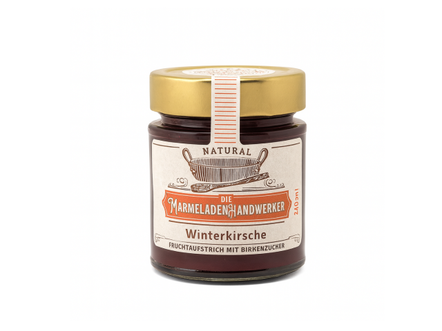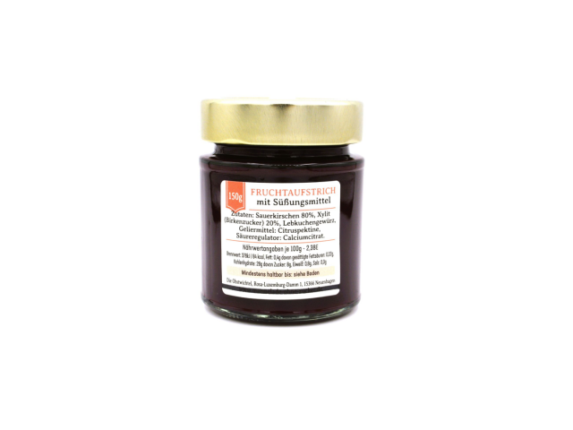 Sauerkirschen 80% - Xylit 20%, Lebkuchengewürz, Geliermittel: Citruspektine, Säureregulator: Calciumcitrat